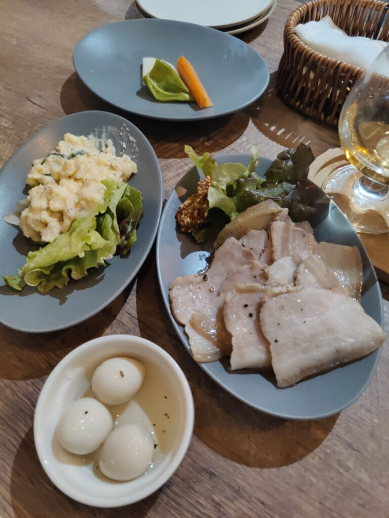 Kartoffelsalat, Wachteleier, Schweinebauch, Gemüse (schon teilweise aufgegessen)