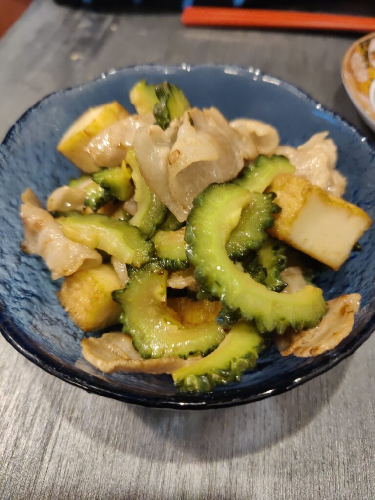 Eintopf mit Goya (Bittergurke), Speck und Tofu