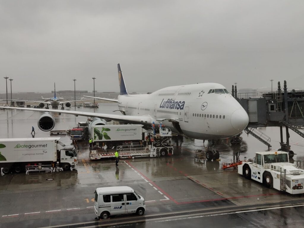 Wir landen im Tokio bei strömendem Regen um 11:50 Ortszeit nach 12 1/2 Stunden Flugzeit.