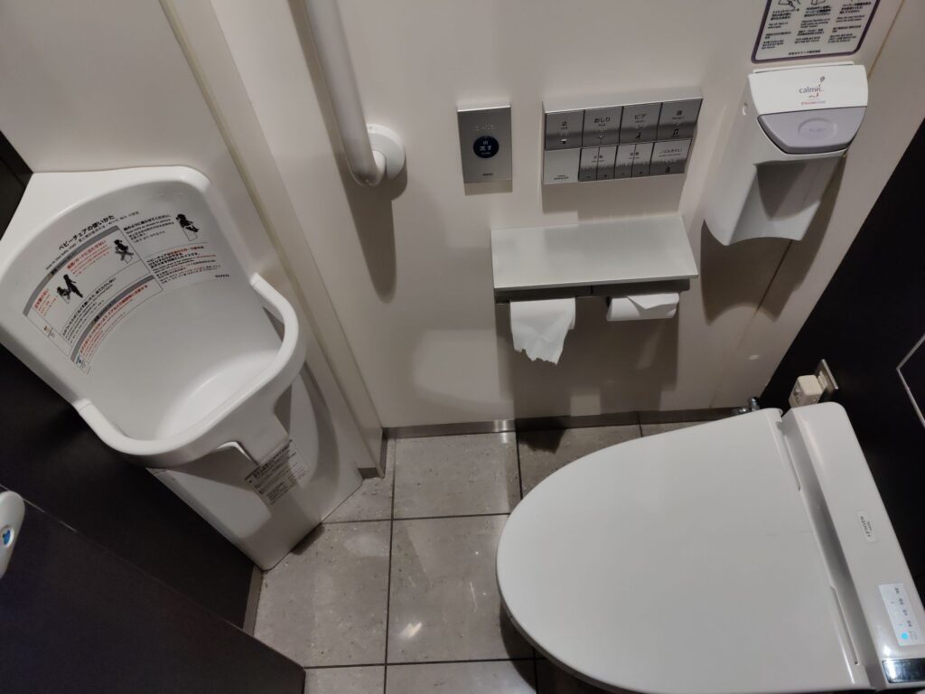 Toiletten. Eigentlich sind in Japan alle öffentlichen Toiletten sauber. Also richtig sauber. Außer die am Nishiki-Markt, was sicherlich an den Touristen liegt. Alle Toiletten haben integrierte Reinigungswasserstrahlen für hinten und vorne. Viele Klobrillen sind beheizt. Manche Kabinen haben sogar einen Kindersitz an der Wand befestigt, um die Kleinen während des Geschäfts sicher „zwischen zu lagern“.
