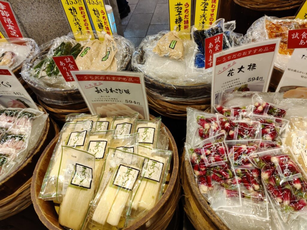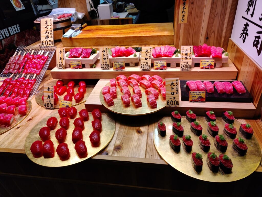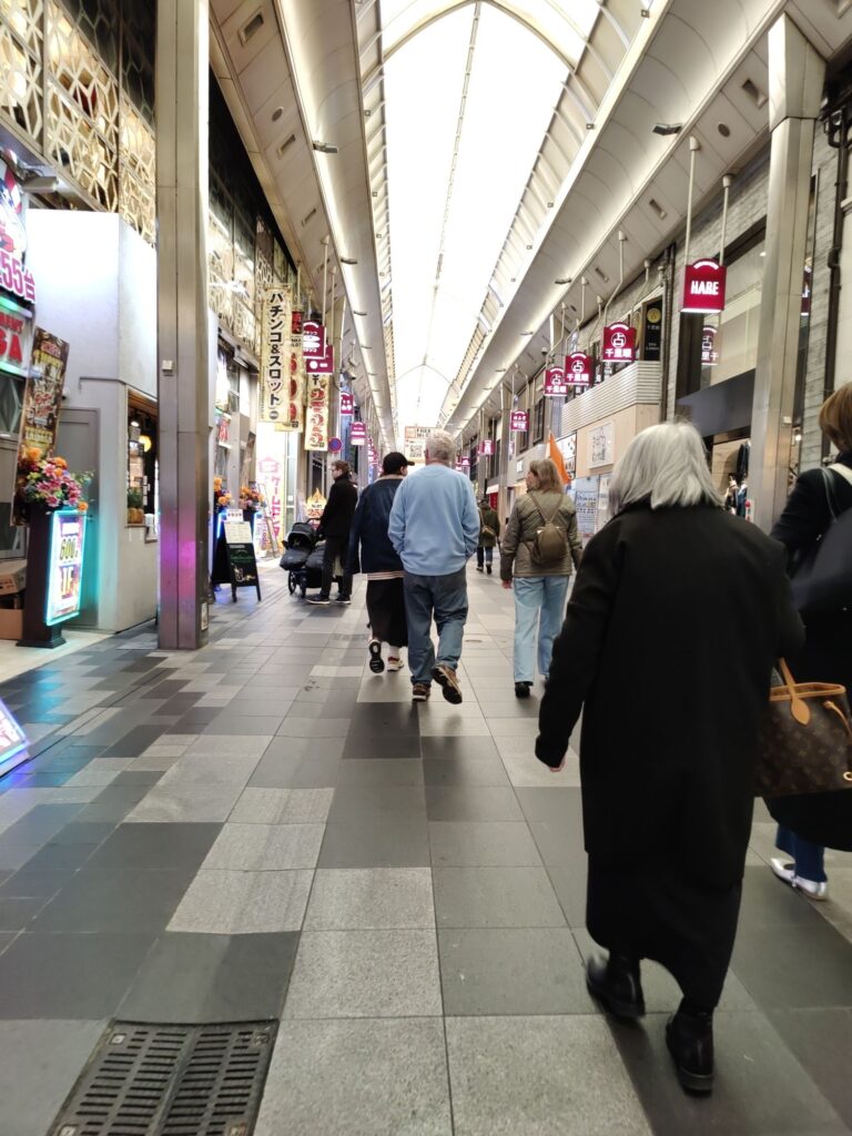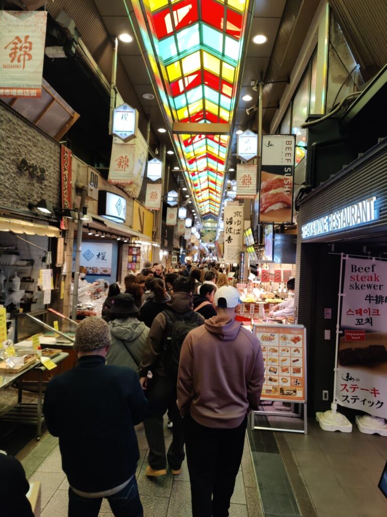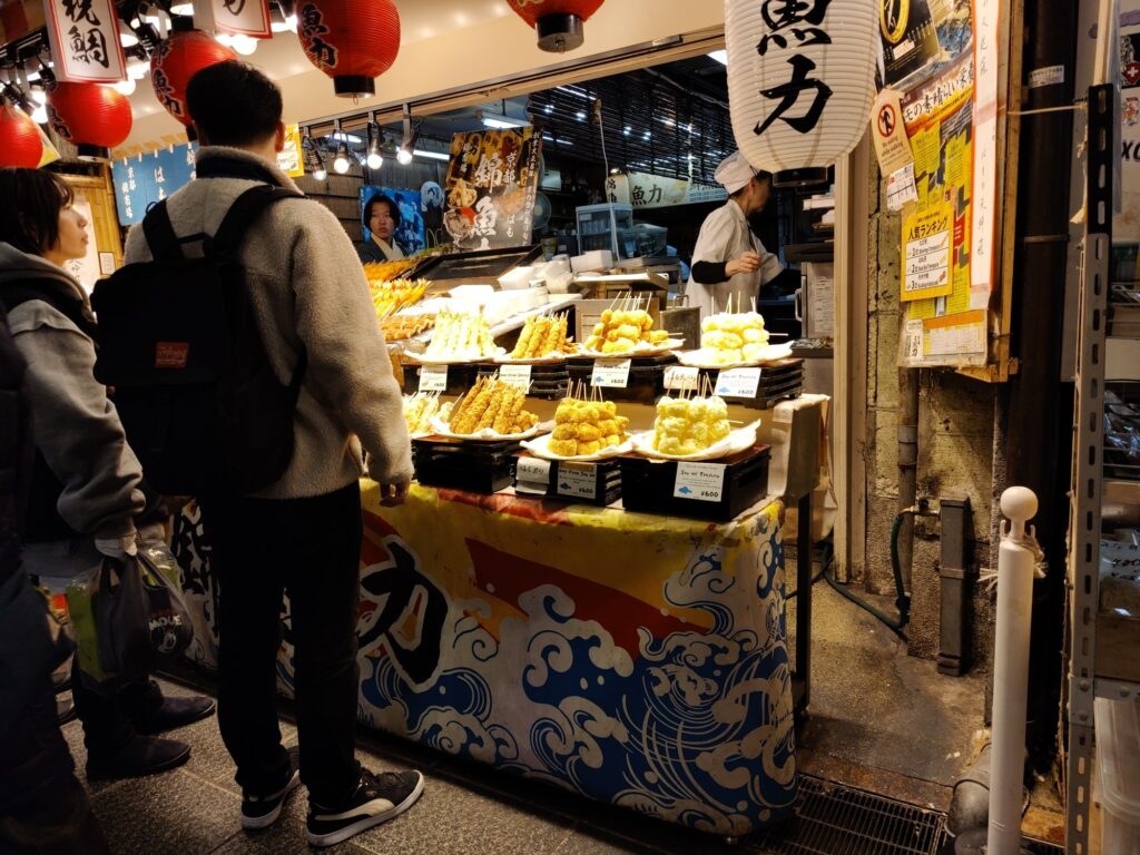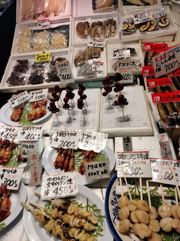 Ein Tempel ist um die Ecke. Dann über die Einkaufsstraße und einen weiteren Kaffee zum Nishiki-Markt, eine Einkaufspassage, in der man vor alle Fressalien bekommt. Ich gönne mir eine Kleinigkeit.